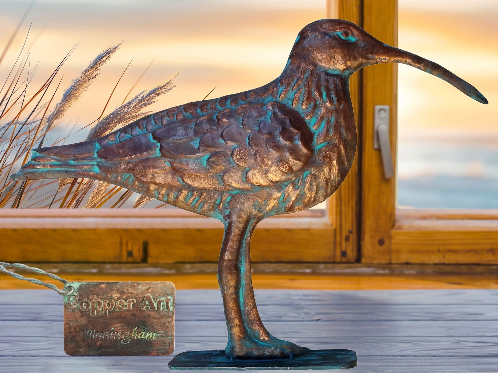 45.5cm Aged Copper/Verdigris Finish 1D Curlew Statue On Heavy Metal Base