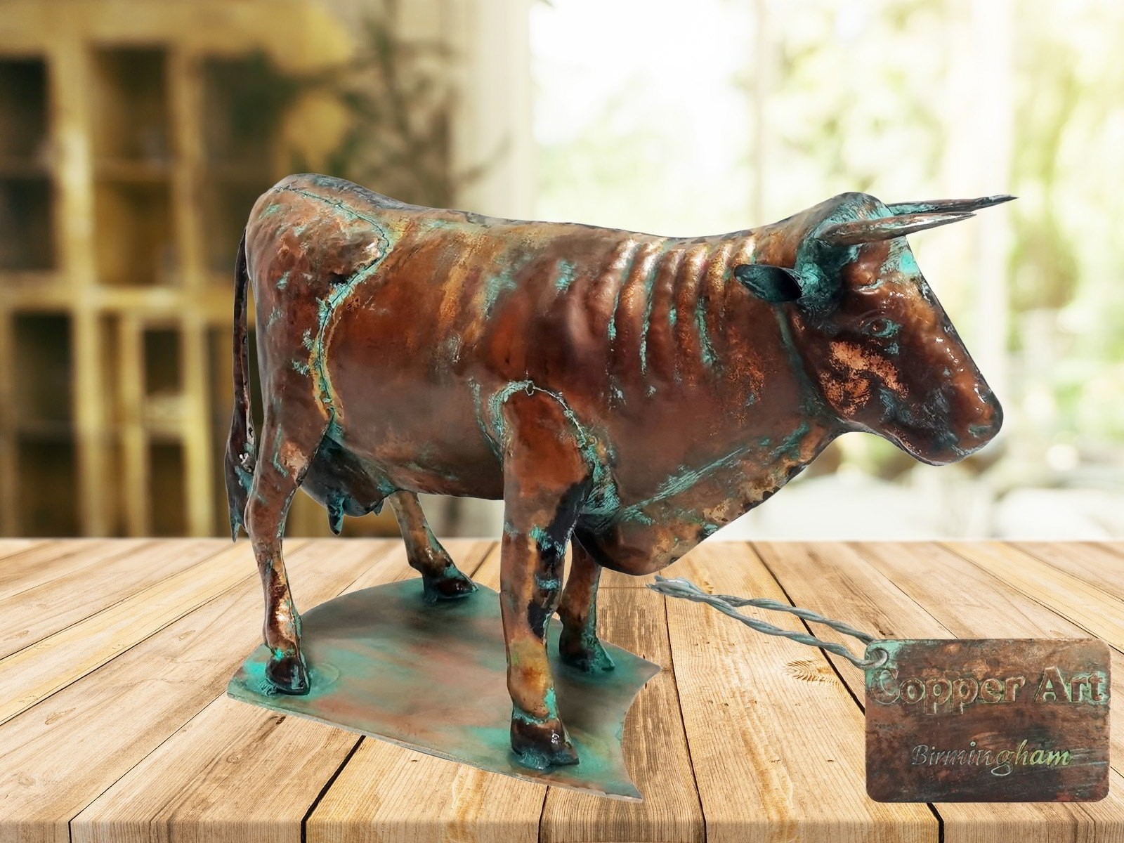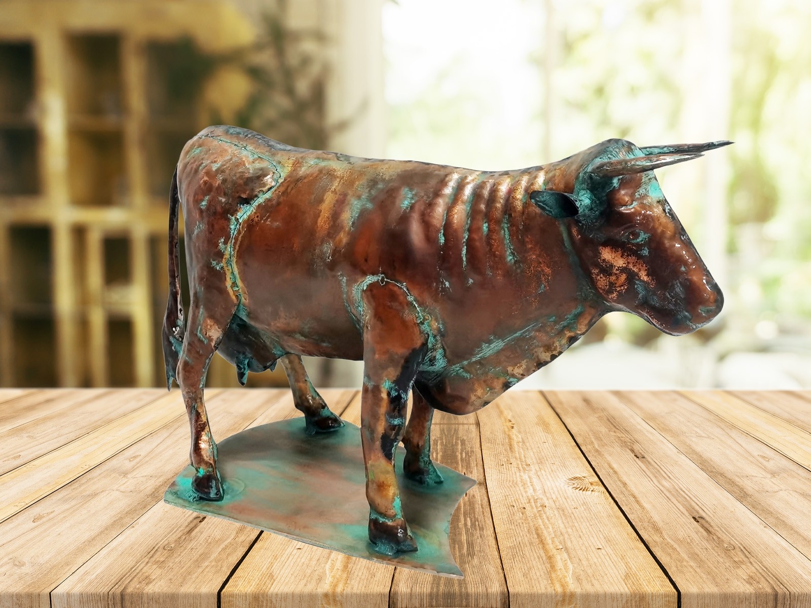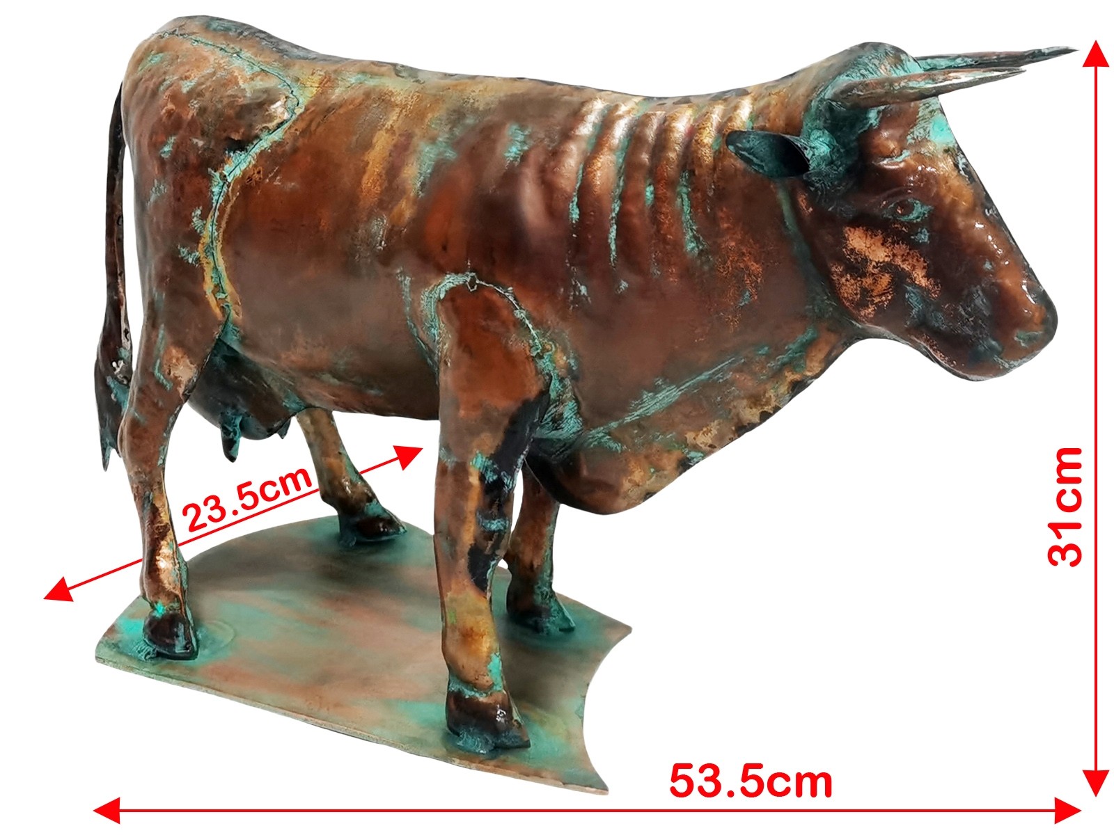 53.5cm Aged Copper/Verdigris Finish 3D Bull Statue On Heavy Metal Base