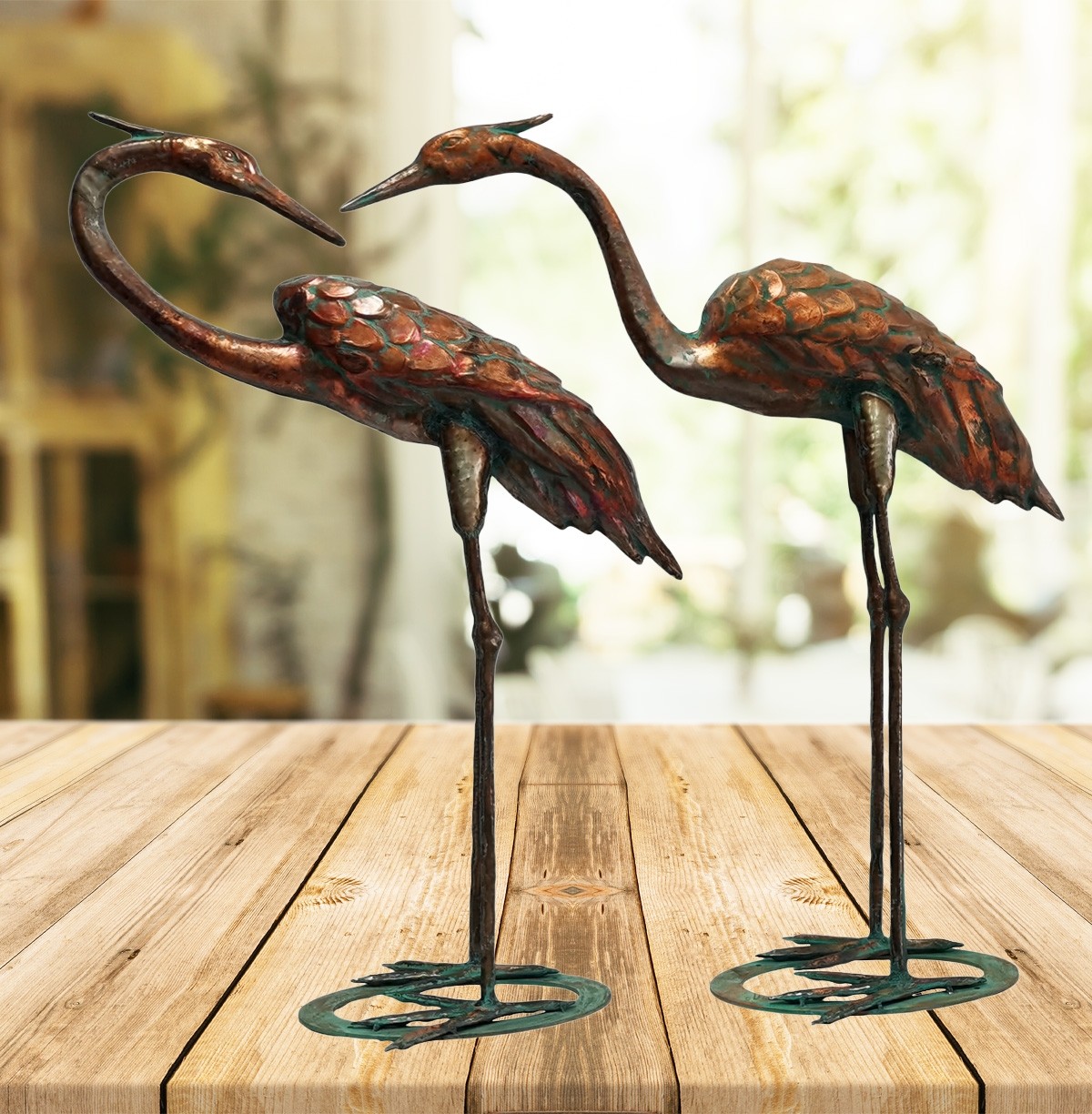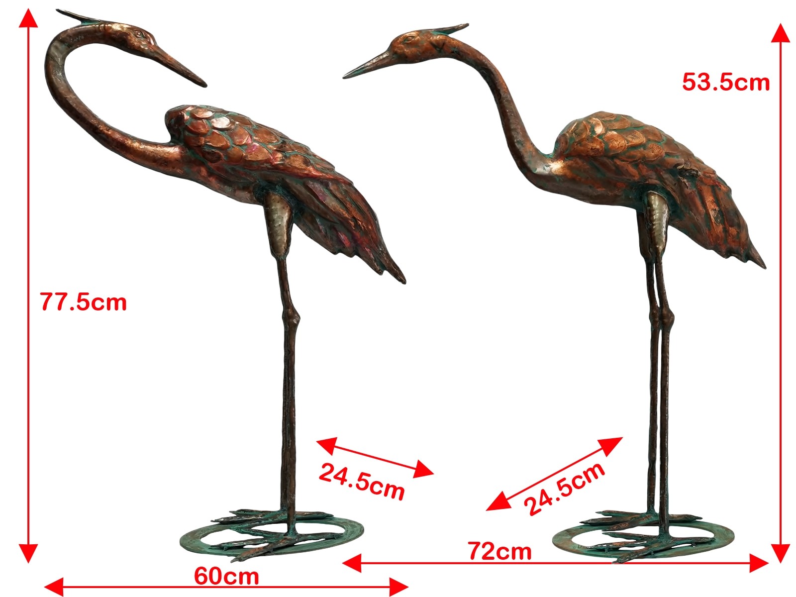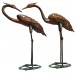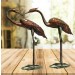 77.5cm. Aged Copper/Verdigris Finish 3D Set of 2 Cranes Statues On Heavy Metal Base