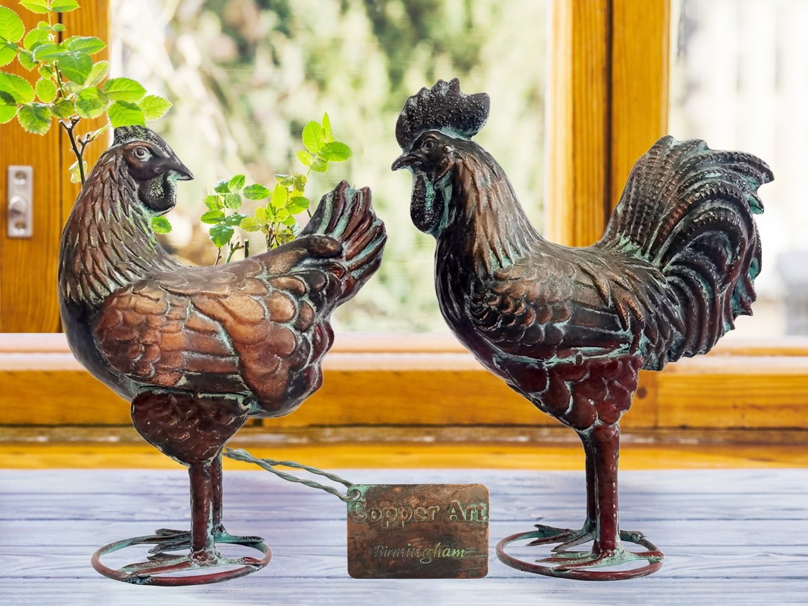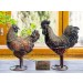 Pair of Aged Copper/Verdigris Finish 3D Small Rooster/Hen Statues On Heavy Metal Base - 27.5cm