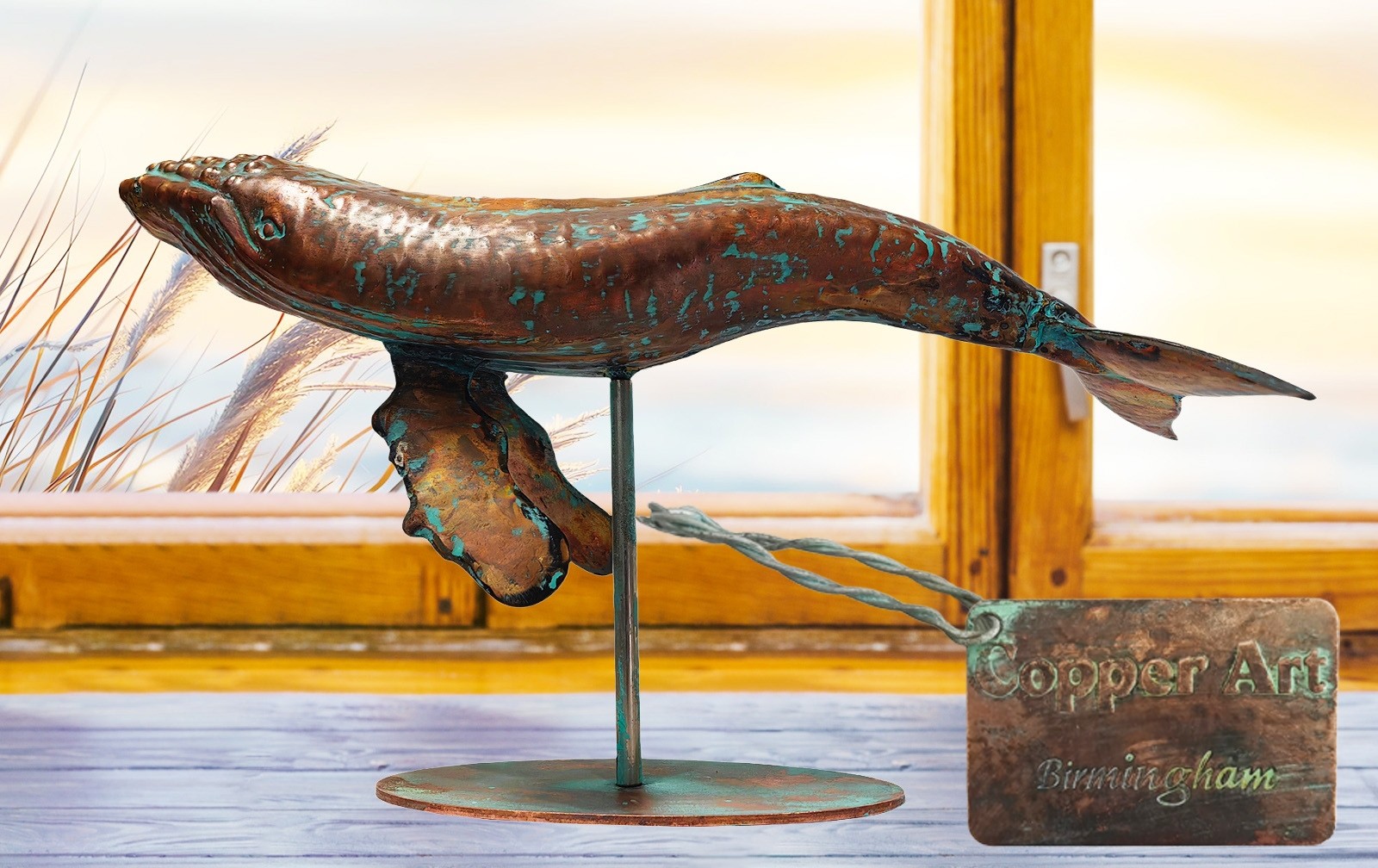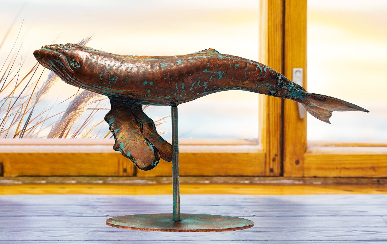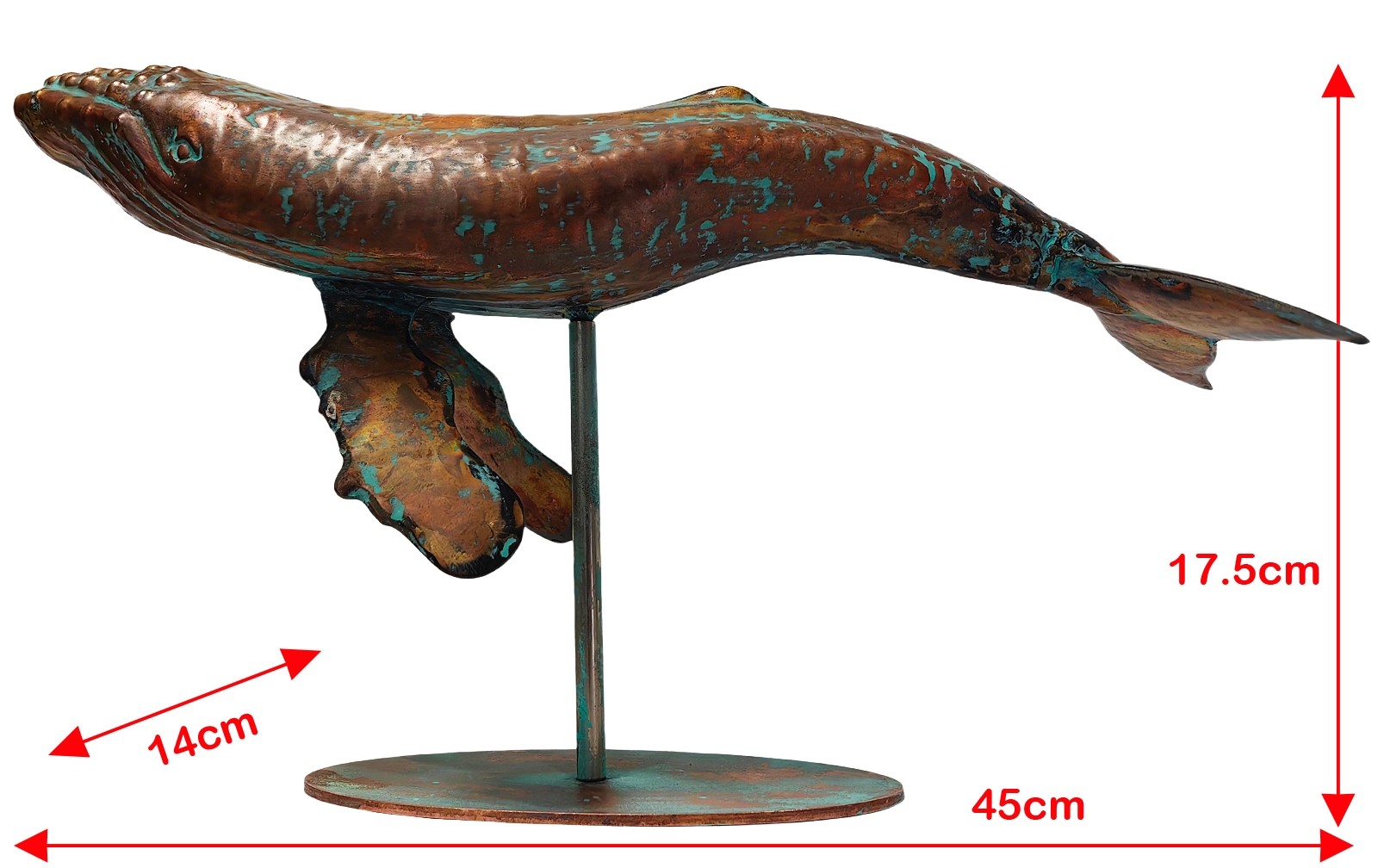 45cm Aged Copper/Verdigris Finish 3D Humpback Whale Statue On Heavy Metal Base