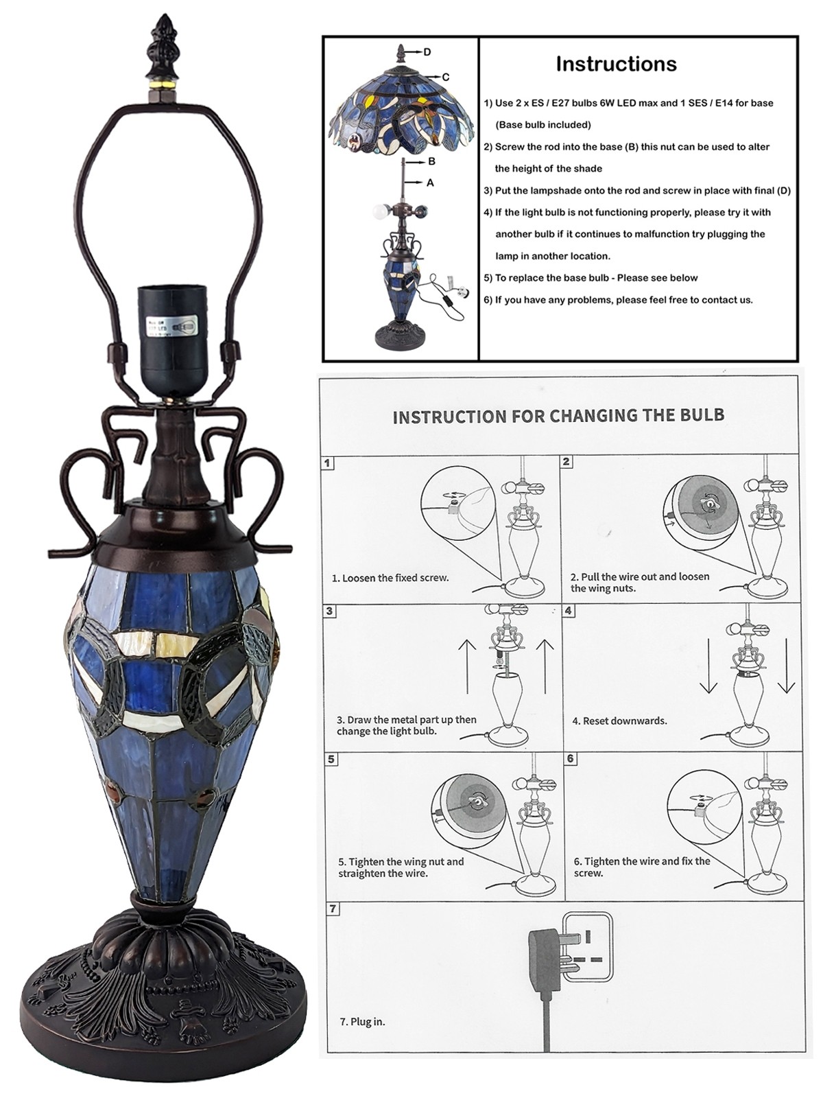Power Cable Length Approx 1.6m with Inline switchItem Measurements (cm) Height Width Depth Origin China Overall 56.0 30.5 30.5 Materials Used Resin / Iron / Favrile Glass Base Only - - - Construction Slight Assembly Packaging Details Qty NW (kg) GW (Kg) CBM Box 1 2.96 - 0.0663 Case 1 2.96 - 0.0663 - Delivery